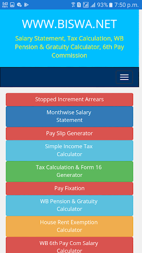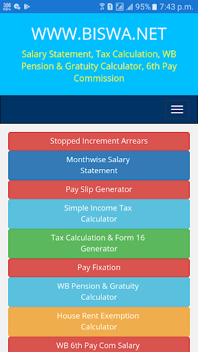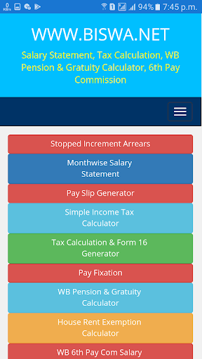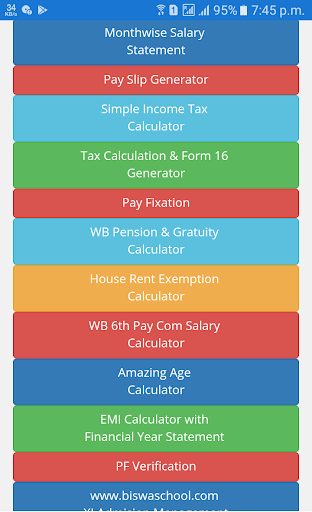 Pernyataan Gaji, Kalkulator Pajak Penghasilan, Pegawai Pemerintah Barat Benggala Pensiun dan perhitungan gratifikasi.Pembayaran Generator Slip, Perhitungan Pajak Penghasilan India dan Form 16 Generator, Kalkulator Pajak Penghasilan Sederhana.Layanan cuti / tanpa membayar / mendapatkan perhitungan cuti.Periksa Bonus, Demo Pengembalian Pajak Penghasilan.Kalkulator Pembebasan Sewa Rumah.Menghentikan kenaikan dan perhitungan tunggakan.Bulan Pernyataan gaji bijak tentang guru sekolah Bengal Barat dan pegawai pemerintah.Dan memberikan informasi bermanfaat tentang pengembalian pajak penghasilan India dan e-filing.