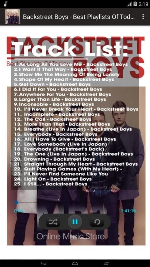 Bạn đam mê âm nhạc của Backstreet Boys, bạn là một Big fan của Backstreet Boys. Bạn muốn nghe nhạc của Backstreet Boys mọi lúc mọi nơi, đi làm, đi chơi, đi tụ tập cùng bạn bè nhưng thật lỡ không may điện thoại bạn vào vùng bị mất sóng hay không có sẵn kết nối internet. Vậy thì làm sao bạn có thể nghe được những ca khúc của thần tượng ? Đừng lo, chúng tôi MP3 Online Music Store sẽ giúp bạn thực hiện điều ước nghe nhạc của Backstreet Boys mà không cần kết nối internet. Chỉ với chiếc điện thoại thông minh bạn chỉ cần vào CH Play và gõ MP3 Online Music Store rồi tìm kiếm nhóm nhạc hay ca sĩ mà mình yêu thích rồi tải ứng dụng nghe nhạc offline đó về, thế là chỉ cần 1 lần tải mà bạn có thể nghe nhạc thoải mái ngay cả khi không có Internet trọn đời rồi. Thật là tiện ích phải không nào?