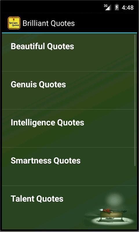 Brilliant Quotes, an extensive collection of quotations by famous authors, celebrities, and famous saying. This application will show you all time hit brilliant quotes. Features:- - It contains sayings from Beautiful, Genius, Intelligence, Smartness, Talent and Winners. - High quality hand picked Quotes. - Browse quotation by famous authors. - And many, many more... Here's what you will get inside this app:- - Famous Quotes which inspire you. - Friendly Quotations. - Unique and different Quotes. - All time famous quotes.