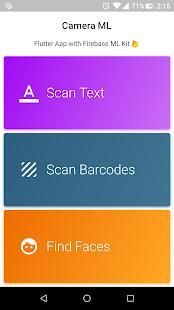 Aplikasi flutter dengan Firebase ML Kit. Aplikasi ini dapat memindai Bar / QR Code, Deteksi Wajah, dan Deteksi Teks dari foto yang diambil oleh kamera perangkat