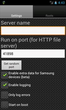 - Add a UPnP Server, and set the following: name, port (for HTTP files serving), enable extra data for Samsung devices, enable logging, only log errors, start the server when connected to a specific WIFI network and disconnect when the WIFI network is lost, or start on boot, add multiple roots (folder which will be shared)