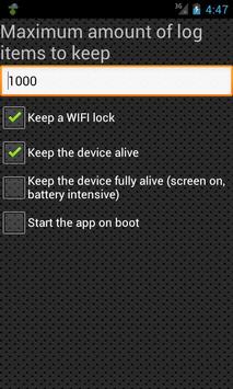 - On the settings page of the app you can set the maximum log items to keep, whether to keep a WIFI lock (prevent WIFI from disconnecting automatically), keep the device alive, keep the device alive full (keep the screen on, battery intensive), set to start the app on boot
