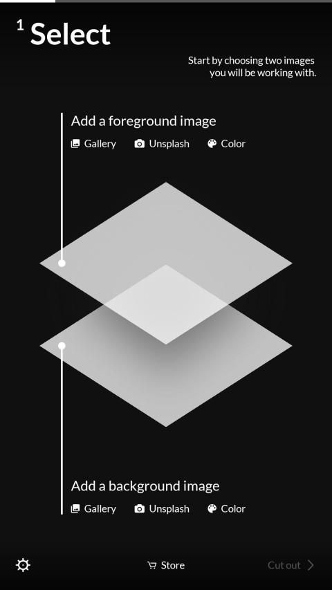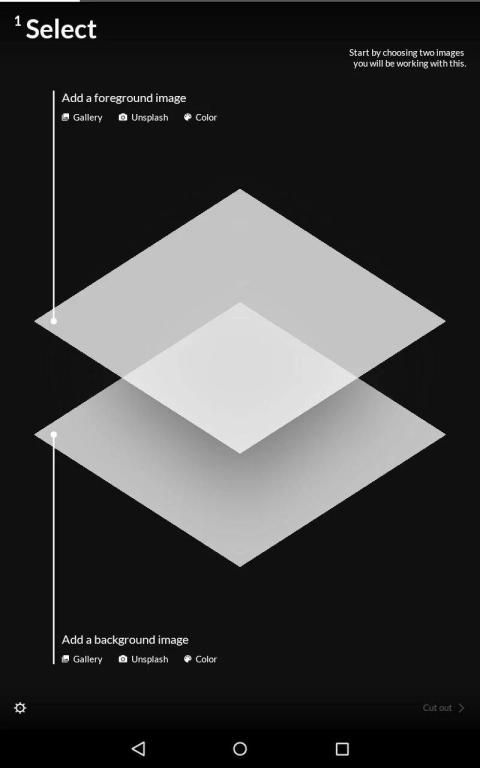 1. Select — Start by choosing the two images you will be working with. You can also pick a solid color, or load a photo from Unsplash.