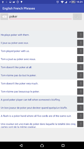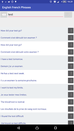 300 000 English French phrases offline features great number of sentences. Type the word that you are looking for and you will be displayed with a number of phrases. Application is made to be used offline - no internet connection needed. For a sentence with selected phrases you also have a text to speech capability - this will enable you to hear how the words and sentences are spoken.Application is free to use.