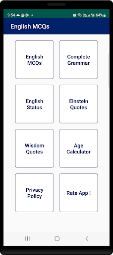 Aplikasi ini memiliki tata bahasa bahasa Inggris topik vise ujian mcq seperti suara aktif dan pasif, artikel, kata sifat, kata keterangan, penentu, pidato langsung dan tidak langsung, perbandingan & amp;Superlatif, perbandingan tidak teratur & amp;superlatif, penggunaan huruf kapital, gerund dan present participle (formulir),