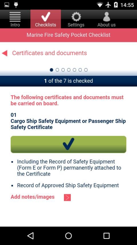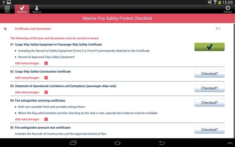 The Marine Fire Safety Pocket Checklist daftar 32 item mana kekurangan yang paling sering ditemukan, 30 sertifikat dan dokumen yang harus dibawa di kapal dan 15 tips untuk membantu memastikan kapal sesuai dengan persyaratan konvensi internasional. Checklist telah nyaman diselenggarakan oleh daerah kapal yang berbeda sehingga awak individu dapat mengambil tanggung jawab untuk daerah kapal dia bertanggung jawab atas.