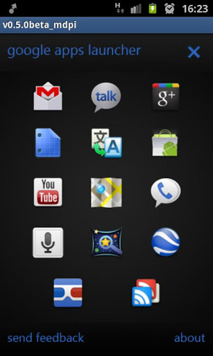 All Google app in one place, one appThis app allows you to launch all installed Google apps on your Android smartphone from one place Hasslefree app launchingBuy donateversion to support in developing more apps.More updates coming soon.If I get enough donation, I will make my next twitter client for free Take a sneak peak from the donate version of Google launcher the apps name will be DestroyTweeter. Familiar? Its design is based on the popular dekstop client DestroyTwitter