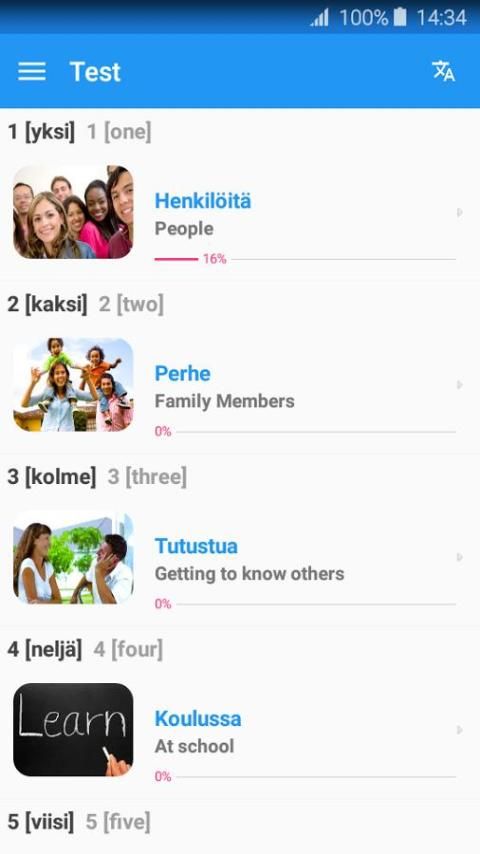 "Orang-orang" "Anggota Keluarga" "Mengenal orang lain" "Di sekolah" "Negara dan Bahasa" "Membaca dan menulis" "Bilangan" "Waktu" "Hari minggu" "Kemarin - hari ini - besok" "Bulan" "Minuman" "Kegiatan" "Warna" "Buah-buahan dan makanan" "Seasons dan Cuaca" "Di sekitar rumah" "membersihkan rumah" "Di dapur" "Small Talk 1" "Small Talk 2" "Small Talk 3" "Belajar bahasa asing " 'Pengangkatan' 'Di kota' 'Di alam' 'Di Hotel - Kedatangan' 'Di hotel - Keluhan' 'Di restoran 1' 'Di restoran 2' 'Di restoran 3'" pada restaurant 4" 'Di stasiun kereta' 'Di kereta' 'Di bandara' 'transportasi umum' 'En rute' 'Di dalam taksi' 'breakdown Car' 'Menanyakan arah' 'Dimana ...?' "Tour Kota" "Di kebun binatang" "Pergi keluar di malam hari" "Pada bioskop" "Di diskotek" "Mempersiapkan perjalanan" "kegiatan liburan" "Olahraga" "Di kolam renang" "tugas Running" "Dalam department store " 'toko' 'Shopping' 'Kerja' 'Perasaan' 'pada dokter' 'Bagian tubuh' 'Di kantor pos' 'Di bank' 'nomor Ordinal' 'Mengajukan pertanyaan 1'" pertanyaan Mengajukan 2" 'Negasi 1' 'Negasi 2' 'kata ganti Posesif 1' 'Posesif kata ganti 2' 'besar - kecil' 'membutuhkan - ingin' 'untuk menyukai sesuatu' 'ingin sesuatu' "harus melakukan sesuatu / harus" 'akan diizinkan untuk' 'meminta sesuatu' 'memberikan alasan 1' 'memberikan alasan 2' 'memberi alasan 3' 'Kata Sifat 1' 'Kata Sifat 2' 'Kata Sifat 3' 'Masa lampau 1' 'Masa lampau 2' "Masa lampau 3" "Masa lampau 4" "Pertanyaan - Masa lampau 1" "Pertanyaan - Masa lampau 2" "Masa lampau dari kata kerja modal 1" "Masa lampau dari modal verba 2" "Imperatif 1" "Imperatif 2" "Bawahan klausa: bahwa 1" 'kalimat dengan bahwa 2' "Anak kalimat jika" 'Konjungsi 1' 'Konjungsi 2' 'Konjungsi 3' 'Konjungsi 4' 'konektor Double' 'Genitive' 'Kata Keterangan'