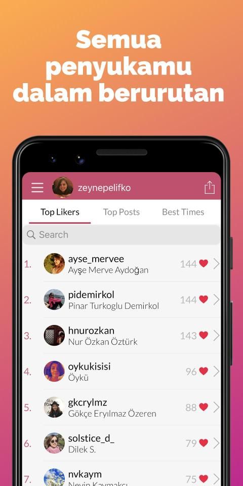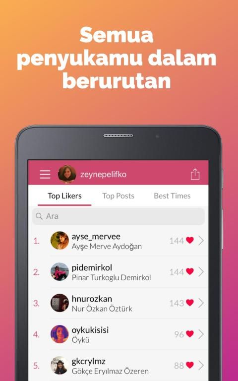 Aplikasi Liker Analyzer mencantumkan pengguna yang paling banyak suka posting untukMu. Ini menawarkan fitur penyaringan dalam daftar penggemar sehingga Kamu dapat menemukan orang yang ingin tahu dengan mudah. Jadi dari daftar ini, penggemar paling ketat langsung dapat ditemukan dan berbagi. Dan posting yang disukai penggemar juga dicantumkan. Selain itu, aplikasi mengurutkan postingmu dari paling banyak disukai ke paling sedikit disukai. Posting populer selalu tersedia untukMu.