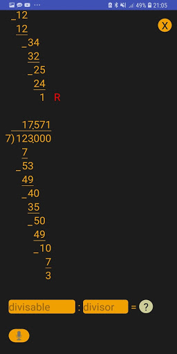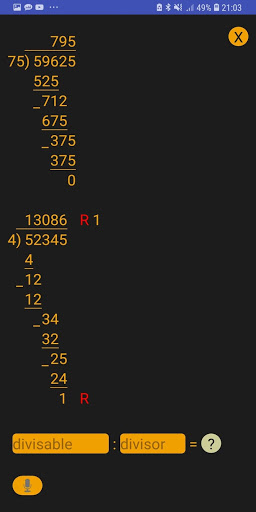 Kalkulator divisi panjang sederhana, intuitif dan minimalis direkomendasikan untuk semua orang yang sedang belajar bagaimana melakukan pembagian panjang. Aplikasi ini menghitung pembagian bilangan bulat panjang dengan sisa.