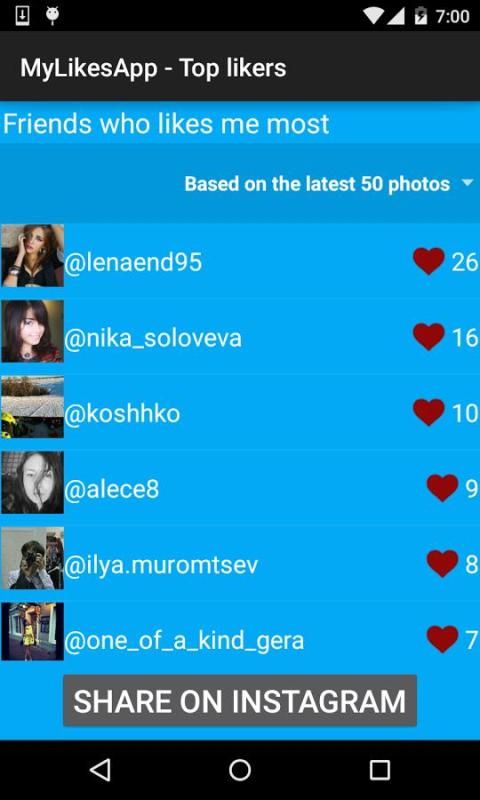 MyLikesApp retrieve information about your photos, calculate likes, find followers who likes you most and then show rating list.