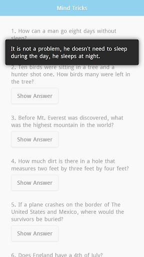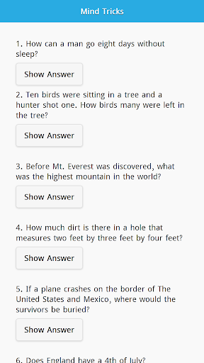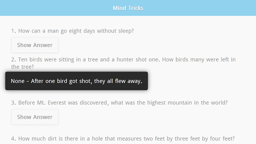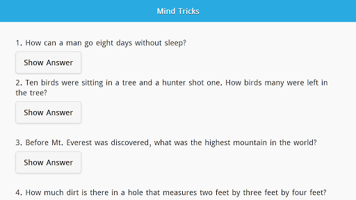 Trik Pikiran Ini Aplikasi Offline akan memberi Anda 200 pertanyaan dengan jawaban tersembunyi.Aplikasi Offline Trik Offline ini akan membantu Anda untuk melatih otak Anda.