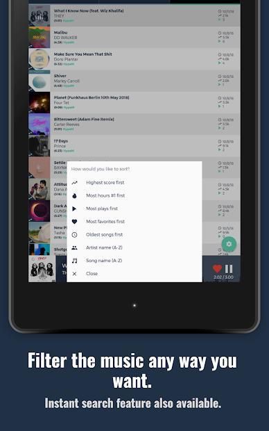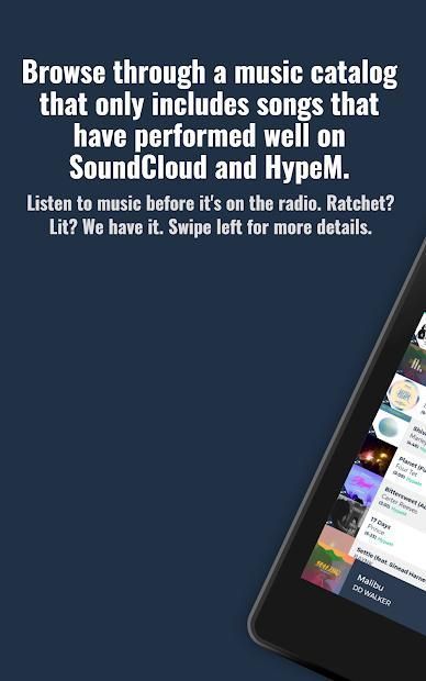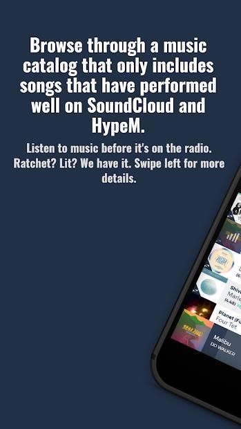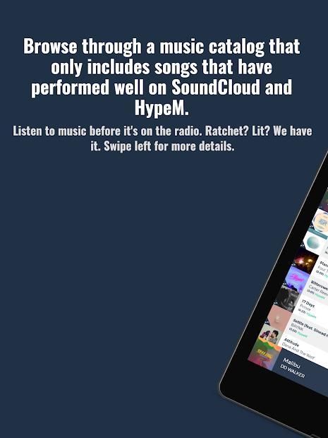 Dengan memantau popularitas lagu di tangga lagu "50 Besar", kami memfilter banyak musik yang tidak begitu bagus. Ide di balik aplikasi adalah bahwa lagu populer lebih cenderung menjadi lagu yang bagus. Ide kami berhasil! Anda akan terus mendengar musik sebelum ada di radio. Geser ke kanan pada lagu apa saja untuk memvisualisasikan data yang menempatkan lagu itu di katalog atau geser ke kiri untuk menambahkan