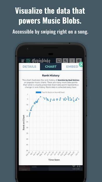 ✓ Swipe right on a song to view a plethora of metadata including a visualization of the data that caused the song to be added to our catalog