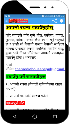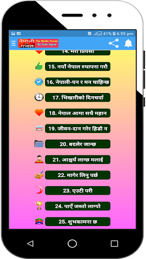 Nepali Gajal-Nepali Sahitya, with Nepali creations like gajals, poems and more. All the bugs are fixed. This is latest Version 2.4