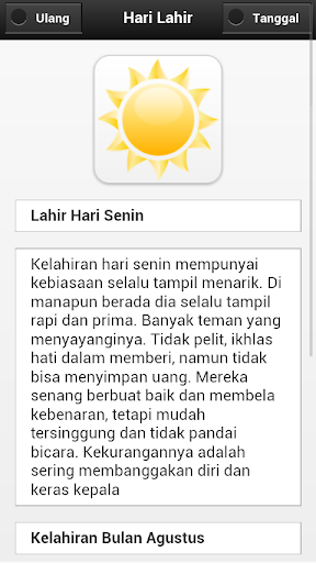 Ketahui makna hari kelahiran anda, termasuk ramalan makna hari, tanggal, bulan, weton, bintang, dan shio anda. Ketahui personalitas anda berdasar hari lahir, tanggal lahir, pasaran, bulan lahir, bintang dan shio anda. Cari tahu juga batu keberuntungan, warna, bunga, dan detail tentang hari kelahiran anda.