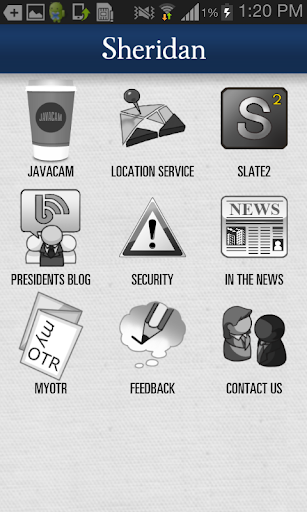 Sheridan dengan bangga menawarkan koleksi aplikasi seluler hybrid untuk meningkatkan pengalaman siswa, fakultas, staf dan pengunjung yang berinteraksi dengan Sheridan. Aplikasi ini dirancang untuk mengerjakan semua ponsel pintar iOS dan Android. Layar akan secara otomatis menyesuaikan sesuai dengan perangkat.