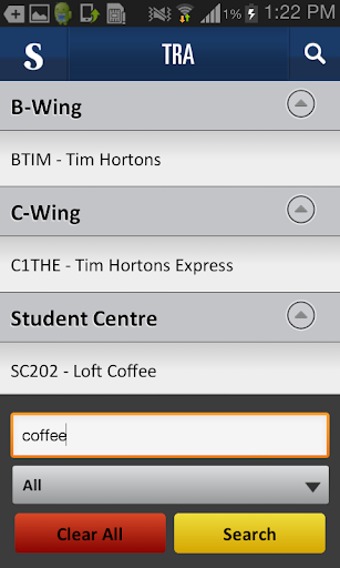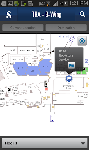 Gunakan tombol pencarian untuk menemukan kamar tertentu, atau cari berdasarkan kategori atau kata kunci untuk menemukan ruang kelas, ruang rapat, makanan dan layanan lainnya di kampus. Ruangan akan ditunjuk di peta kampus dan lantai di bawah tab tujuan.