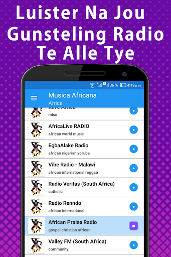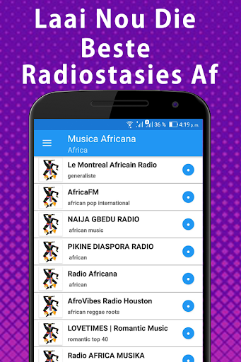 Lagu-lagu terbaik dari musik Afrika mendengarkan stasiun radio gratis dengan grup dan band dari Afrika, jadi nikmati aplikasi hebat Anda dapat mendengarkan musik tradisional Afrika dan dari mana pun Anda berada, karena Anda tidak memerlukan pemain untuk mengunduh musik preferensi Afrika Utara dari Irama khas Afrika, dalam konsep ini ada sejumlah besar genre. Dengan hits terbaik dalam musik dari Mesir Kuno hingga musik Berber dan musik Tuareg. Gaya: Musik Arab dan Andalusia, musik dari Sudan dan Tanduk Afrika, termasuk musik dari Eritrea, Ethiopia, Djibouti, dan Somalia. Musik dari Uganda, Kenya, Rwanda, Burundi, Tanzania, Malawi, Mozambik dan Zimbabwe serta pulau Madagaskar, Seychelles, Mauritania dan Como. Musik dari Afrika Selatan, Lesotho, Swaziland, Botswana, Namibia, musik dari Angola, Senegal dan Gambia, dari Guinea dan Guinea-Bissau, Sierra Leone dan Liberia, dari dataran pedalaman Mali, Niger dan Burkina Faso, negara-negara pesisir Pantai Côte d'Ivoire, Ghana, Togo, Benin, Nigeria, Kamerun, Gabon dan Republik Kongo serta pulau-pulau seperti Sao Tome dan Principe.