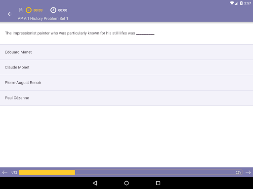 Siswa dapat memanfaatkan aplikasi Sejarah AP Varsity GRATIS untuk Smartphone dan Tablet bertenaga Android untuk mendapatkan -Speed pada sejarah seni yang luas. Pengambil tes akan dibor pada karya seni yang penting dan fungsinya dari prasejarah, Mediterania kuno, Amerika kolonial, kemudian periode waktu Amerika dan Amerika, dan Amerika asli. Siswa juga akan diminta memiliki pengetahuan tentang pengaruh seni kontemporer Asia, Pasifik, Afrika, dan global.
