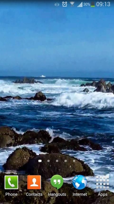 Menonton raksasa biru Samudera Live Wallpaper gelombang laut yang mengalir gelombang laut yang besar pada pantai berbatu, gelombang biru menakjubkan mengalir bolak-balik kanan pada layar Anda dengan langit biru di cakrawala.