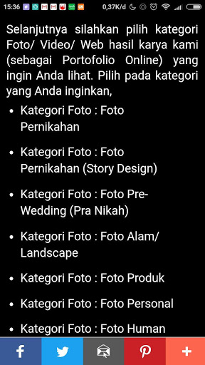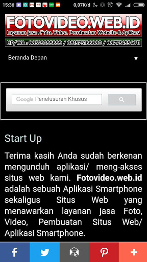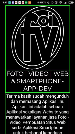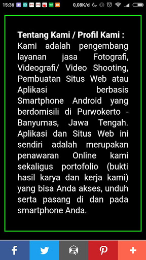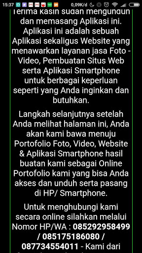 Aplikasi ini adalah aplikasi Penawaran sekaligus Portofolio Online atas layanan jasa : Fotografi, Video Shooting/ Videografi, Pembuatan Situs Web serta Pembuatan Aplikasi 4ndro1d. Kami berdomisili di Purwokerto - Banyumas, tetapi siap untuk traveling dan melayani Anda dimanapun Anda berada.