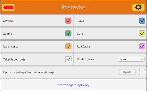 Kami belajar warna interaktif adalah aplikasi yang dirancang sebagai motivasi dan semacam warna untuk memenuhi warna. Ini ditujukan untuk anak-anak dengan beberapa kesulitan, meskipun aplikasi juga dapat menggunakan anak-anak dari perkembangan khas. Aplikasi ini didasarkan pada penggunaan elemen audiovisual yang dekat dengan anak-anak dengan penekanan pada kesederhanaan dan pengenalan yang jelas. Menu utama menawarkan empat tingkat berat progresif (pengenalan warna, perbedaan warna, buka kunci pintu, warna dominan) yang bertujuan untuk memfasilitasi pembelajaran, mengidentifikasi dan membedakan warna. Pengguna dapat juga memilih warna yang ingin digunakan dalam aplikasi, suara, tampilan teks, dan penggunaan khusus yang mengubah parameter aplikasi tertentu, yang diadaptasi dengan aplikasi dengan beberapa persyaratan kesulitan. Aplikasi ini dikembangkan bekerja sama dengan tim ahli rumah sakit khusus untuk distrik kronis Bistro atas untuk membuat aplikasi untuk penampilan dan fungsionalitas aplikasi disesuaikan dengan beberapa kesulitan.