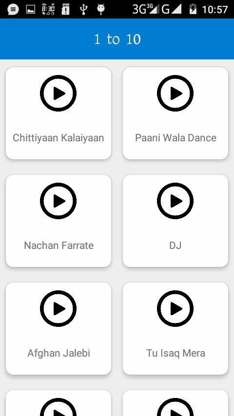 Aplikasi ini telah dibuat dari musik populer Bollywood. Aplikasi ini memiliki 3 layar. layar daftar lagu dan layar lain dari video musik ditampilkan.