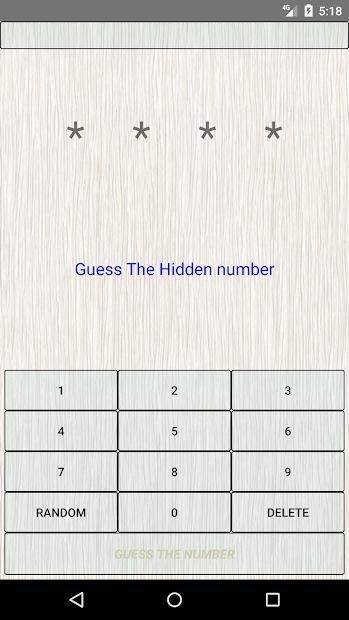 Cobalah untuk menebak Nomor Tersembunyi dengan petunjuk yang diberikan. Anda dapat mengaturnya untuk 3,4 atau 5 digit angka. Setiap kali Anda menebak jumlah tersembunyi itu memberikan beberapa petunjuk yang dapat digunakan untuk membuat menebak berikutnya lebih akurat dan menuju nomor tersembunyi.