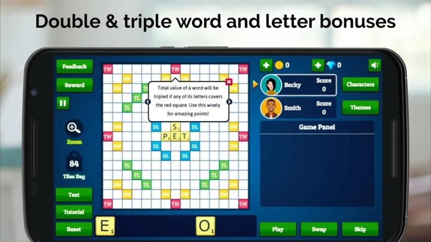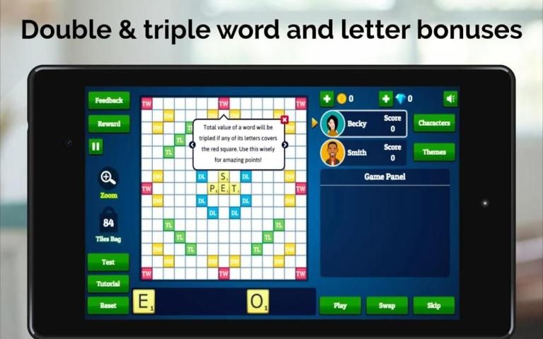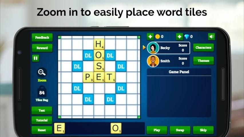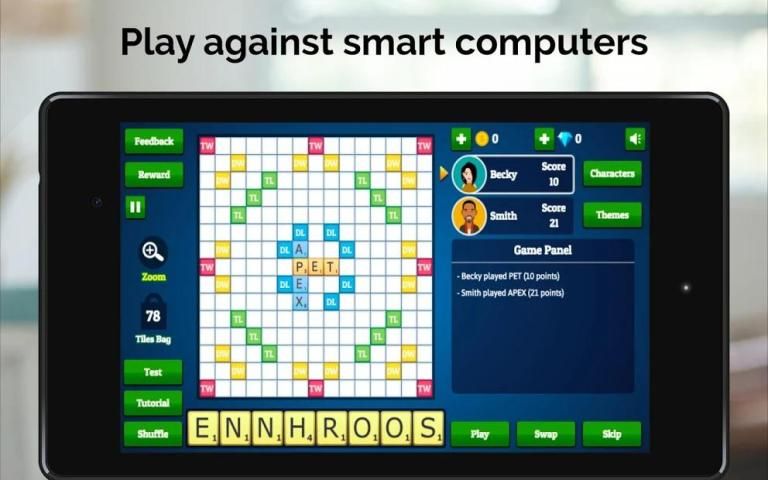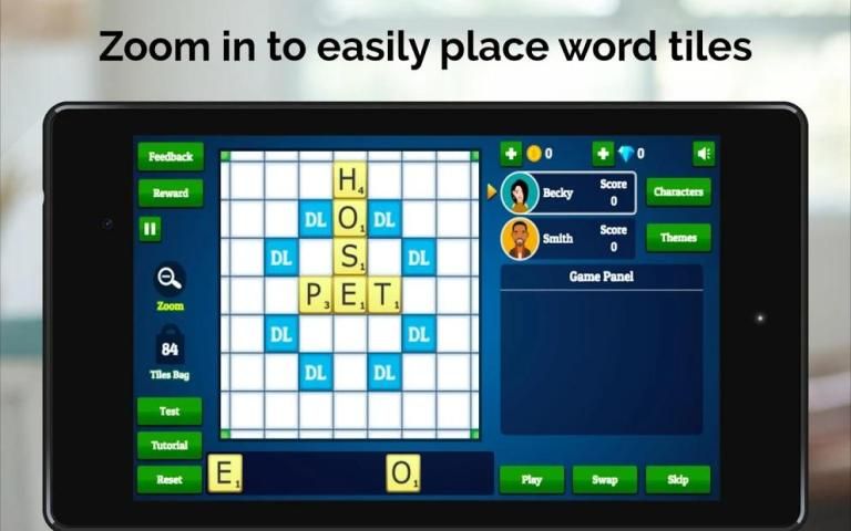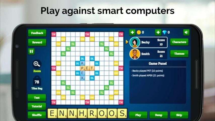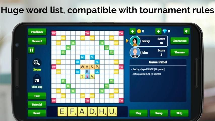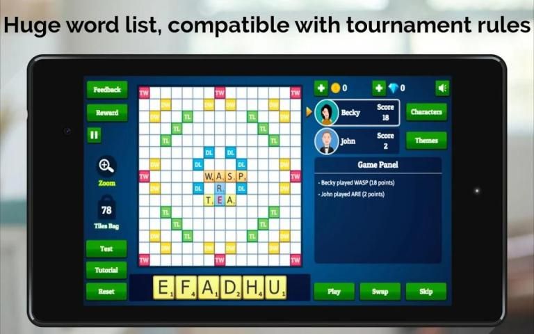 Our English dictionary supports over 10,000 English words, using the Collins Scrabble Dictionary. This is compatible with world tournament standards.