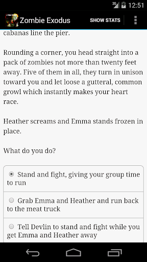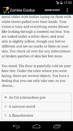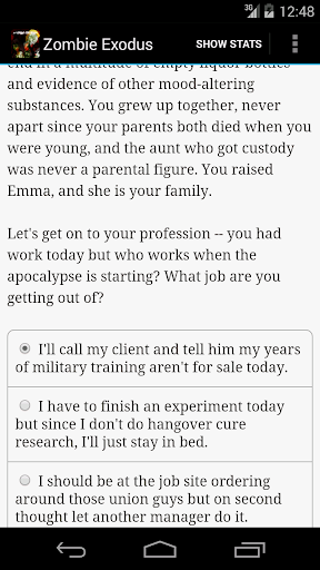 "Zombie Exodus" is a thrilling 750,000-word interactive survival-horror novel by Jim Dattilo, where your choices control the story. It's entirely text-based--without animation or sound effects--and fueled by the vast, unstoppable power of your imagination.