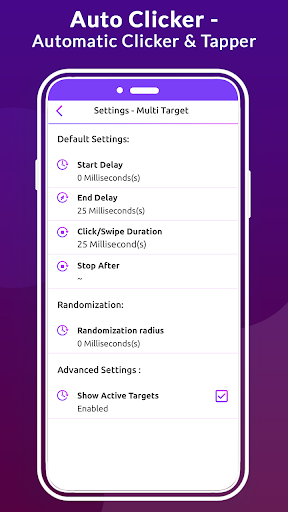 has an adjustable target mode with which you can touch or move on any side in the mobile device to use this option most while you are playing a game and need to continues clicks on the game. just put target mode and tap on play button it will automatically start clicking. the app also allows the best option for users to set particular counts with your way.