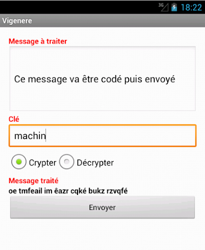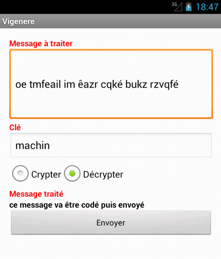 Questa applicazione consente di scambiare messaggi crittografati dalla crittografia del Vigenere e inviarlo con qualsiasi applicazione del dispositivo (SMS, posta, viber, whatsapp, scatto ecc ...).