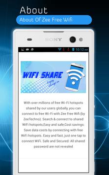 Zee Free WiFi is a smart phone application that allows users to Create and discovers Free WiFi Hotspots around them and connects to them to enjoy Free WiFi internet.More over after successful connection user can check speed of the connection,signal strength and a test security level for the connection.