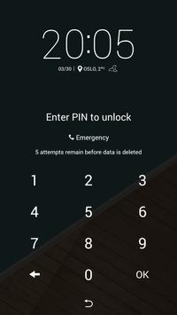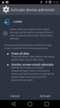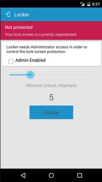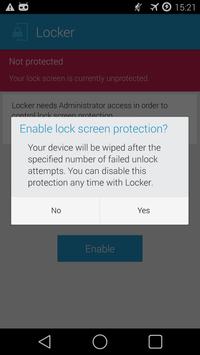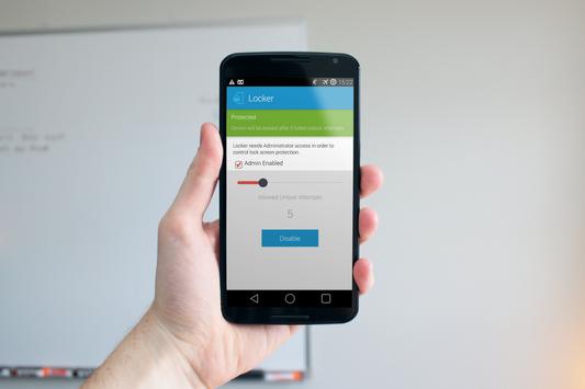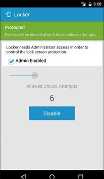 Locker activates and enforces the security policy that will trigger a full system wipe when the specified number of unlock attempts have been exhausted. Depending on what lock screen application you are using the user will be presented with warning messages when the number of remaining attempts is 4 or less.