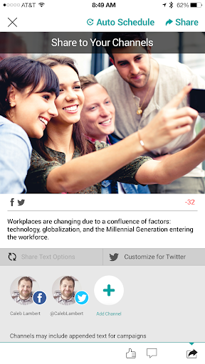 • Share approved content directly to your social networks from your smartphone