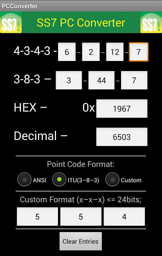 The tool supports 24 bit ANSI point codes in the 8-8-8 format, 14 bit ITU point codes in the standard 3-8-3 format, also optionally in 4-3-4-3 format, and also allows you to define your own custom point code format of up to 24 bits enabling you to use JAPAN point codes in the custom 7-4-5 format, or other European 0-X-X formats.