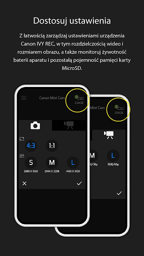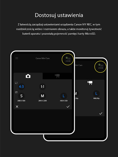 Wykorzystaj w pełni swoją kamerę zewnętrzną Canon IVY REC dzięki aplikacji Canon Mini Cam. Po sparowaniu ze zgodnym urządzeniem mobilnym, takim jak smartfon, możesz używać aplikacji jako wizjera na żywo do robienia zdjęć i nagrywania filmów, a nawet używać jej jako zdalnej migawki z zegarem. Informuje ona także o ważnych ustawieniach, w tym o czasie pracy akumulatora aparatu Canon IVY REC, pozostałej pojemności karty MicroSD dla obrazów, rozdzielczości nagrywania wideo (720p lub 1080p) i rozmiarze obrazu. Aby wyświetlać i udostępniać zdjęcia i filmy, aplikacja umożliwia bezprzewodowe przesyłanie ich na kompatybilne urządzenie mobilne w celu drukowania, udostępniania i edycji. Dodatkowe funkcje zostaną udostępnione w przyszłych aktualizacjach.