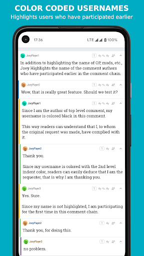 - Nomes de usuário de codificação de cores : destaca os usuários que participaram anteriormente na cadeia de comentários.Super útil para acompanhar as conversas em longas cadeias de comentários.