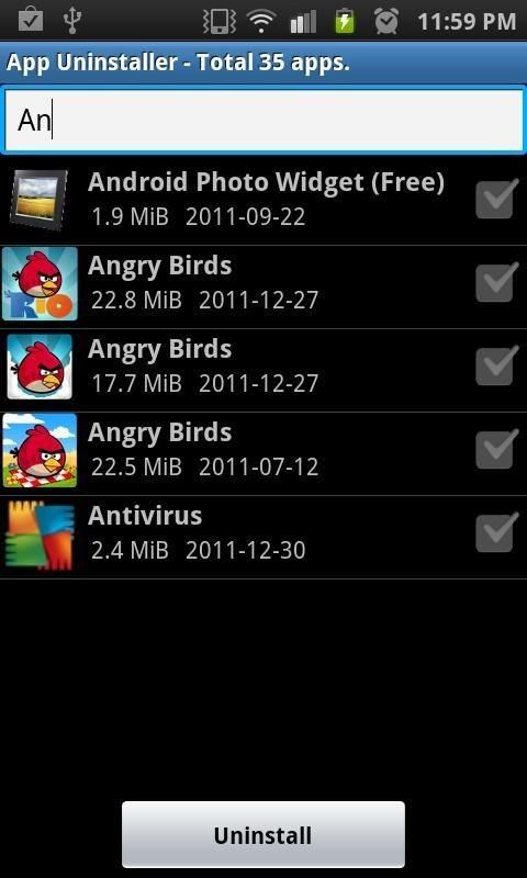Simple and fastest multi app uninstaller on Android! Features & Specialities: * Removes multiple applications at a time. * Displays total number of apps, app name, size and date. * filter apps by name * Apps listed based on alphabetic sort.