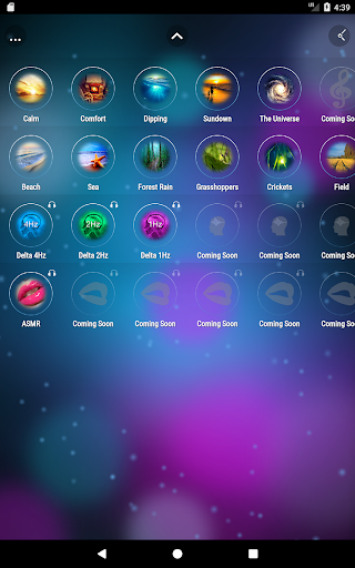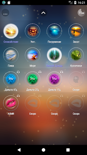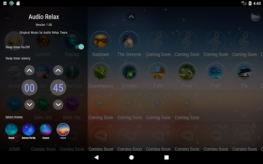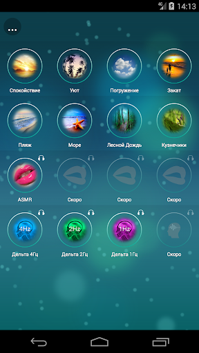 - Звуки природы: Море, Пляж, Дождь в лесу, Сверчки, Кузнечики, Поле (Насекомые), Гром, Костер.
