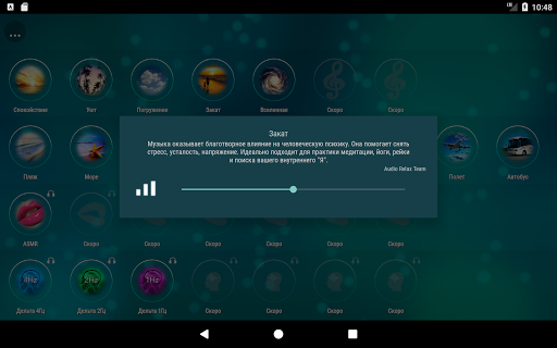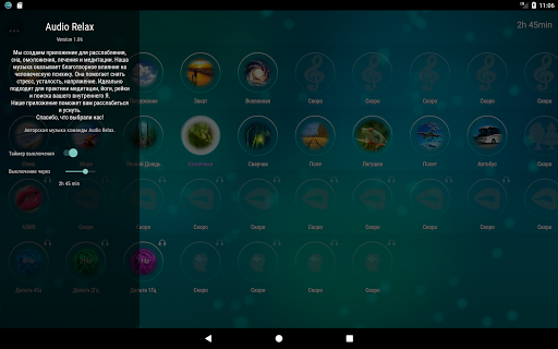 Audio Relax - приложение антистресс, музыка и звуки для сна, расслабления, омоложения, восстановления сил и медитации. Наша музыка оказывает благотворное влияние на человеческую психику. Она помогает снять стресс, усталость, напряжение. Идеально подходит для практики медитации, йоги, рейки. Audio Relax поможет вам расслабиться и уснуть.