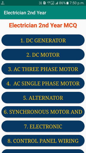 ELECTRICIAN MCQ FOR Electrician 2nd Year APP IS VERY USEFUL FOR ITI ELECTRICIAN TRADE. THE MCQs ARE COLLECTED FROM VARIOUS SOURCES FROM INTERNET. NOW DAYS, ONLINE EXAMS WITH MCQs ARE VERY USEFUL IN PREPARATION FOR COMPETITIVE EXAMS (LIKE-RAILWAY, WBSEDCL, WBSETCL, BHEL, SAIL, ETC. & ELECTRICAL CORE INDUSTRY ALSO).