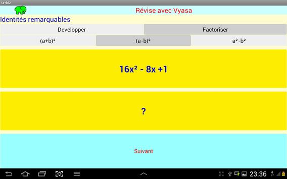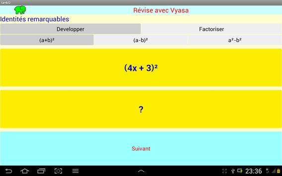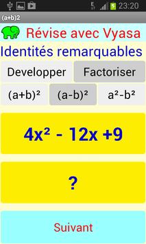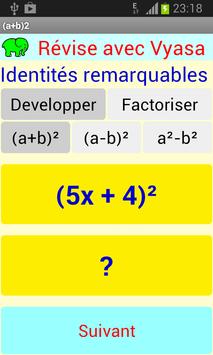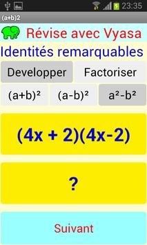 Cette application, gratuite et sans publicité, fonctionnant sur les smartphones et tablettes, permets de s'entrainer à résoudre des identités remarquables.