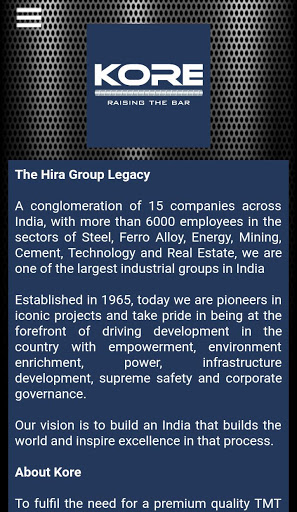 Kore - это бренд высокопроизводительных комбайнов TMT от Hira Группа. Линия продукта в основном состоит из 500 и более высоких оценок известных для его превосходной способности, повышенной прочности и более высокой жизни.