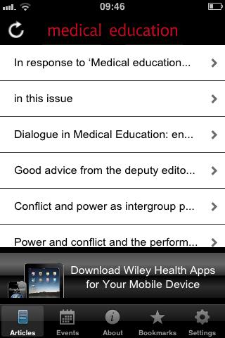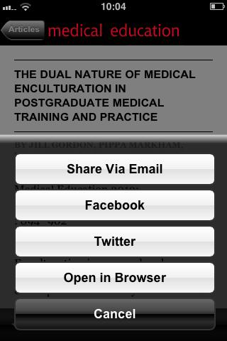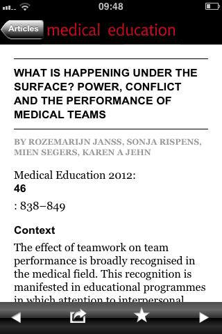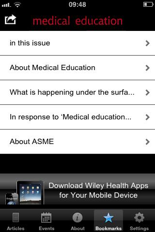 Stay informed with our leading international medical education journalMedical Education is the preeminent journal in the field of education for health care professionals, and publishes material of the highest quality, reflecting worldwide or provocative issues and perspectives. With the rapid publication of new articles every month, it can be hard to stay focused on the most relevant and useful content. This app allows you to easily access the latest article abstracts and information on forthcoming events.With abstracts on a range of topics, its simple and easy to navigate, flag articles for later reading, and share amongst your friends and colleagues.Key Features:1. Instant, realtime access to the latest abstracts from Medical Education, plus information on upcoming events.2. No need to manually update; your application automatically refreshes with the most uptodate content.3. Ability to use the app offline as well as flag abstracts for later reading.4. Share content via email or through social networking sites like Twitter and Facebook.