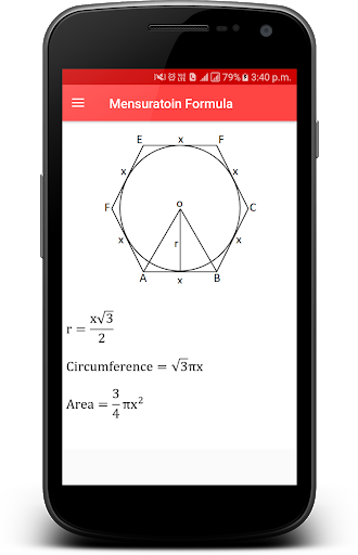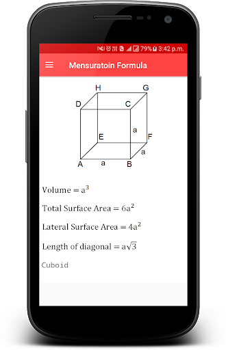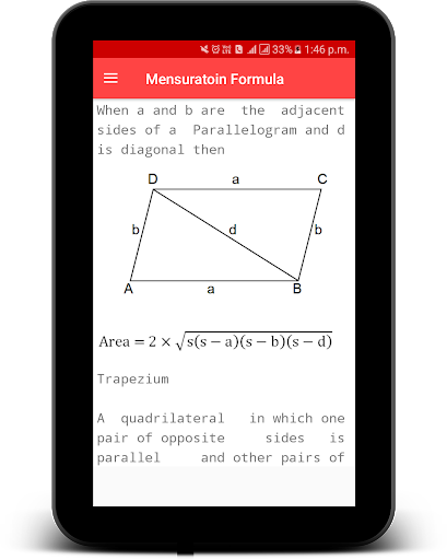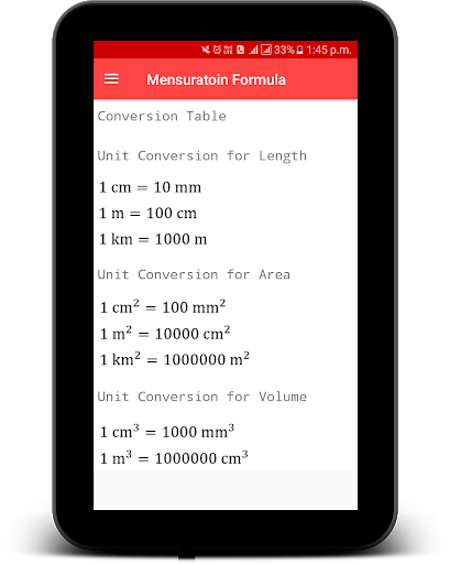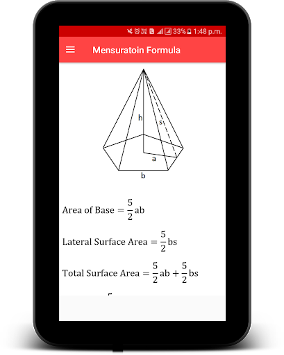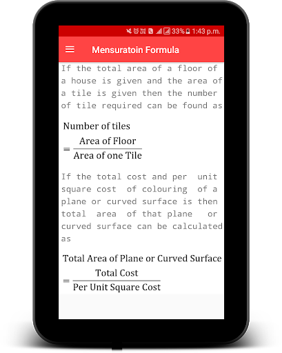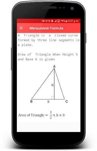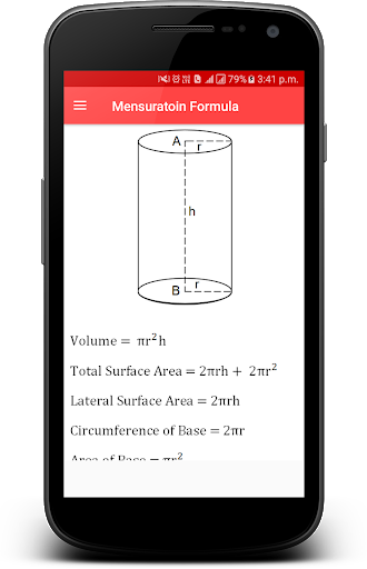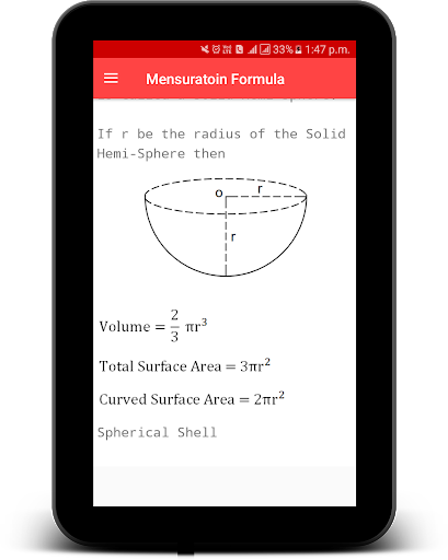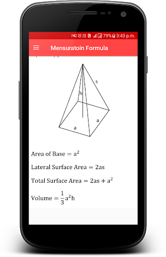 Приложение Mensuration Formula - это автономное приложение. Это приложение содержит более 130 формул для расчета периметра, общая площадь поверхности, боковой площади поверхности, окружности, радиуса, диаметра и объема различных плоскости и твердых диаграмм. Это приложение содержит формулу следующих плоскостей и сплошных фигур.