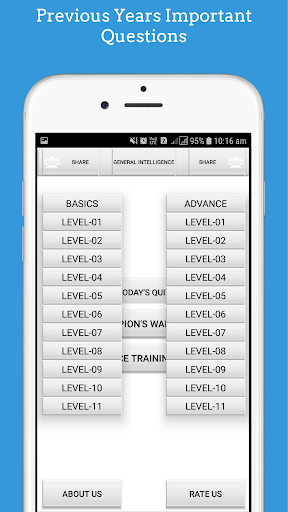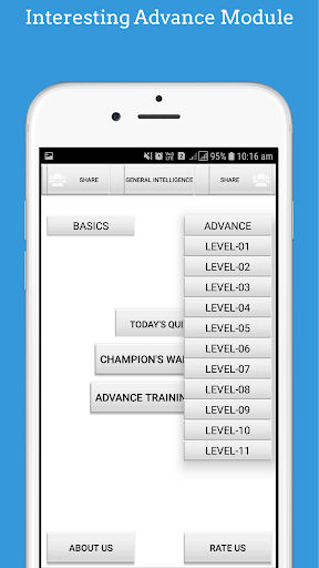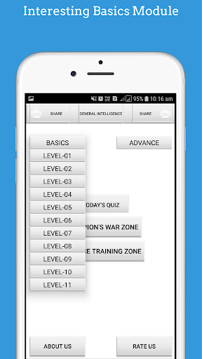 basics quiz and advance quiz. Each part having 11 levels, it also have 5 War Zone, and one advance training zone which gives you a bumper opportunity to increase your reasoning knowledge.