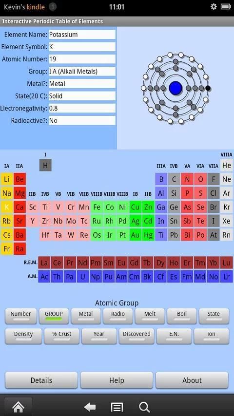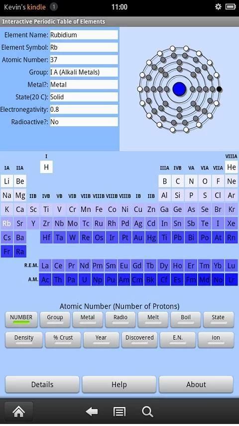 A 'details' screen includes information a chemistry student needs, along with a brief explanation of the name, symbol, and family - typically the items young students are most curious about.