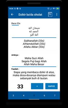 dilengkapi dengan bacaan arab dan latin serta ada artian dan faedah dari bacaan dzikir tersebut.